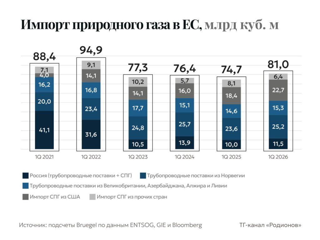 Несмотря на перекрытый Ормузский пролив и форс-мажор, объявленный Катаром по поставкам газа, в первом квартале 2026 года европейские страны ударными темпами закупали голубое топливо. Совокупно импорт газа вырос на 8%, перешагнув порог в 80 млрд кубометров.