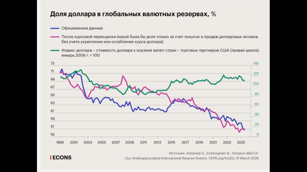 Эмпирические исследования подтверждают, что доля доллара в резервах тесно связана с силой экономических, финансовых и геополитических связей страны с США. Ослабление этих связей или сомнения в надежности альянсов могут ускорить отказ от доллара. Для юаня негативными факторами выступают геополитические риски и сравнительно низкая доходность.