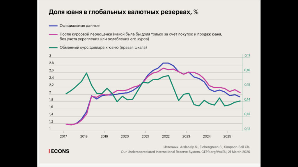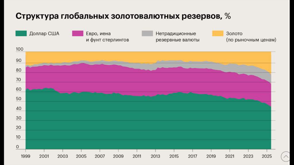 Ключевым вопросом остается выбор альтернативных активов. Исторически в качестве основных кандидатов рассматривались евро и юань. Однако текущая динамика демонстрирует иной тренд: рост доли в резервах австралийского, канадского, сингапурского долларов, вон Южной Кореи и скандинавских валют. Это может объясняться их привлекательной доходностью и снижением транзакционных издержек. При этом юань, вопреки ожиданиям, теряет свои позиции: его доля снизилась с пиковых 3% в 2021 году до менее 2% к концу третьего квартала 2025 года, несмотря на политику стимулирования его использования.