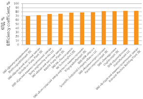В целях оптимизации проведения закупок специалистами отрасли был выполнен [1] анализ рынка соответствующего насосного оборудования на территории России. Были рассмотрены более 20 российских предприятий – производителей насосного оборудования для перекачки нефти, нефтепродуктов и прочих технологических потоков [4, 5]. По результатам обзора были отобраны 11 предприятий, выпускающих насосы для НПЗ. На рис. 1 представлено значение КПД наилучших насосов отечественных производителей. Видно, что проектная документация насосов разных предприятий определяет средний КПД агрегатов на достаточно высоком и стабильном уровне – разброс значений составляет 70–82 %.