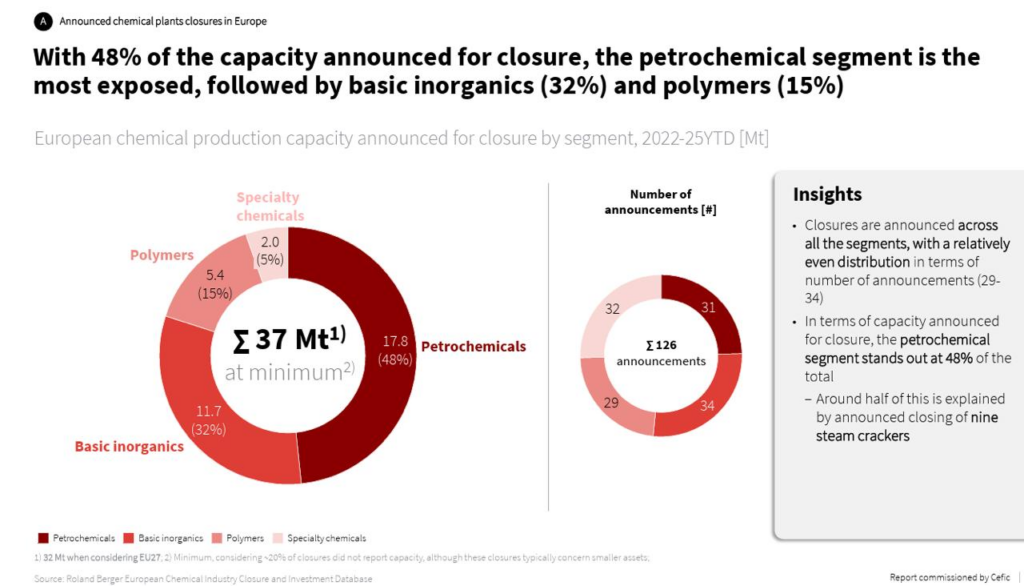 Согласно данным отчета Европейского совета химической промышленности (CEFIC), в период с 2022 по 2025 годы, суммарный объем производственных мощностей химических предприятий, расположенных на территории Евросоюза и Великобритании, снизился на 9%. За этот период в странах ЕС и Британии было официально заявлено о закрытии 160 химических предприятий.