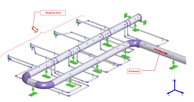 Рисунок 1. Изометрическое изображение существующего трансферного трубопровода – выход из печи П1 и объединение в общий коллектор