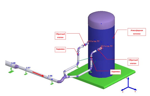 - На входе в колонну (Рисунок 2) проектировщик установил обратные клапаны и клиновые задвижки. Конструкция обратных клапанов такова, что они являются источником вибраций при прохождении через них двухфазного потока. Нормативные документы только рекомендуют устанавливать обрат-ные клапаны на входе в аппараты, работающие под давлением, но окончательное решение оставляют за проектировщиком. К сожалению, такая ошибка, как установка обратных клапанов на ТДП встречается часто и каждый раз возникают проблемы со сверхнормативной вибрацией трубопроводов.