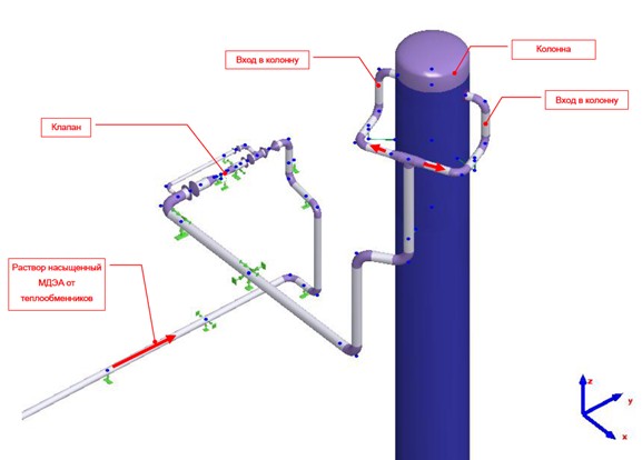 На рисунке 4 показана правильная конструкция трубопровода подачи насыщенного раствора МДЭА в колонну-регенератор. Необходимо отметить, что организация, проектировавшая эту установку 8 лет назад не расположила правильно дросселирующий клапан на входе в колонну, но даже в этом случае принятые вышеописанные меры по адаптации элементов трубопровода позволяют достичь нормативных показателей вибрации.