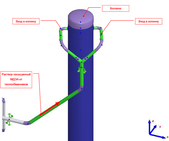 Рисунок 2. Изометрическое изображение существующего трансферного трубопровода –коллектор и вход в колонну